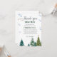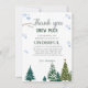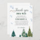 Elegante celebración de cumpleaños de invierno gracias tarjeta con acuarela de ilustracion de pinos y copos de nieve. Las palabras dicen "gracias a la nieve por hacer que mi cumpleaños sea maravilloso".