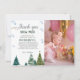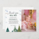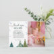 Elegante celebración de cumpleaños de invierno gracias tarjeta con acuarela de ilustracion de pinos y copos de nieve. Las palabras dicen "gracias a la nieve por hacer que mi cumpleaños sea maravilloso".