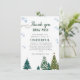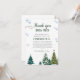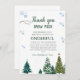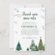 Elegante celebración de cumpleaños de invierno gracias tarjeta con acuarela de ilustracion de pinos y copos de nieve. Las palabras dicen "gracias a la nieve por hacer que mi cumpleaños sea maravilloso".