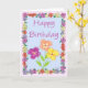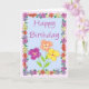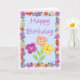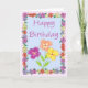 Una preciosa carta de cumpleaños con flores de color dibujadas a mano sobre un fondo rosa y un marco floral.