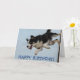 Perro collie fronterizo rebotando de una tarjeta de saludos de pared. El texto en la parte delantera dice "¡Feliz cumpleaños!" y el texto dentro dice "¡Espero que tengas un gran día!"