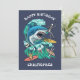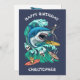 Diseño de tarjetas de cumpleaños de personalizado de oleada de tiburón. Alimentar el frenesí mientras se monta en las olas. Ataque de tiburón; estética retro.