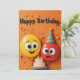 Esta juguetona tarjeta de cumpleaños incluye dos globos animados —uno amarillo y otro rojo— sonriendo alegremente sobre un pastel festivo con velas. El fondo naranja está lleno de confeti colorido y decoración minúscula, mientras que el extravagante texto "Feliz Cumpleaños" se agrega a la diversión, con una segunda línea retorcida con humor. Perfecto para los niños o para cualquier persona con un espíritu divertido, esta tarjeta es ideal para los alegres y alegres deseos de cumpleaños.