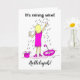 Dibujo animado divertido de una mujer de pie bajo la lluvia recogiendo vino en su copa. Lleva un vestido rosa y ha tirado su paraguas y bolso. El pie de foto dice 'Está lloviendo vino' y 'Aleluya'. Personalice fácilmente esta tarjeta de cumpleaños editando el texto de la plantilla. ¡Gracias por ver mis diseños de dibujos animados!