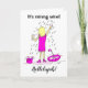 Dibujo animado divertido de una mujer parada bajo la lluvia atrapando vino en su vaso. Lleva un vestido rosa y ha tirado su paraguas y bolso. El título dice 'Está lloviendo vino' y 'Aleluya'. Personalice fácilmente esta tarjeta de cumpleaños editando el texto de la plantilla. ¡Gracias por ver mis diseños de dibujos animados!