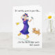 Tarjeta de cumpleaños motivadora y desenfadada con una mujer bailando y cantando con un perro pequeño, de un ilustracion de pluma y lavado de Judy Adamson. El texto de portada es una cita bien conocida de Abraham Lincoln.