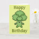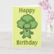 Dibujo divertido de brócoli verde con una gran sonrisa feliz. Plantillas de texto arriba y abajo que dicen Feliz Cumpleaños. Mantener como está o cambiar a su propio texto.