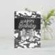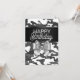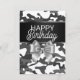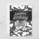Tarjeta de cumpleaños personalizado con "Feliz cumpleaños" en tipografía mixta, arco de plata, cinta de satén negra y fondo de camuflaje blanco.