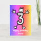 Dibujo animado lindo de un número tres con cara sonriente y manos y pies. La tarjeta tiene un fondo con efecto de purpurina colorido. ¡Envíe esta tarjeta al niño de tres años en su vida para celebrar su tercer cumpleaños! Personalice fácilmente esta tarjeta editando el texto de la plantilla en el frente y en el interior. ¡Gracias por ver mis diseños!