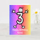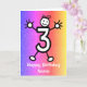 Dibujo animado lindo de un número tres con cara sonriente y manos y pies. La tarjeta tiene un fondo con efecto de brillo colorido. ¡Envíe esta tarjeta al niño de tres años en su vida para celebrar su tercer cumpleaños! Personalice fácilmente esta tarjeta editando el texto de la plantilla en la parte frontal y posterior. ¡Gracias por ver mis diseños!
