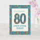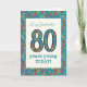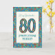 Una tarjeta de cumpleaños específica a la edad bonita para una abuela de ochenta años, con el número 80 y la frontera llenada de un estampado de flores retro colorido en un fondo verde azulado. El estampado de flores es parte "de la colección elegante y Painterly de la impresión de la abuelita", de un collage de papel pintado a mano de Judy Adamson. Este diseño cabrá todos los tamaños de la tarjeta de felicitación.