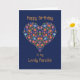 Tarjeta de cumpleaños de bonito para una novia, con un patrón floral en forma de corazón sobre un fondo azul profundo, inspirado en el arte folclórico de Europa del Este. Parte de la colección "Corazón popular" de Posh & Painterly.