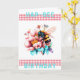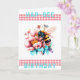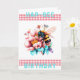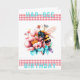 Tarjeta de cumpleaños Hap-Bee. Una acuarela de una abeja que recoge polen de flores de bonito. Una tira de gingham de color rosado encima y debajo de la imagen principal, con las palabras "Hap-Bee" Birthday en color turquesa. Los colores principales son el rojo, el turquesa y el amarillo. Dentro del mensaje se lee: "disfruta tu día especial". Este mensaje puede ser personalizado para escribir sus propias palabras especiales.