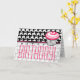 Una tarjeta de cumpleaños con fondo de patas traseras en blanco y negro. La mitad inferior de la cubierta inferior de la cubierta rosada. El texto negro y rosa dice "¡Feliz cumpleaños!" Ilustracion de quequitos rosados a la derecha. En el interior se muestra el fondo de una cabina de patas rojas. Busque artículos coincidentes en la categoría "Tienda de Cumpleaños" de The Pink Schoolhouse store.