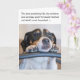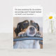 Una tarjeta de cumpleaños humorística con una imagen fotográfica a color de un perro descansando su barbilla en el brazo de una silla de oficina en una 'pose atractiva'. El texto de la parte delantera de la tarjeta dice: "He estado reflexionando sobre la vida, el universo y todo eso, y he resuelto totalmente lo más importante..." Dentro de texto se lee: "... tú y las cookies, aunque no necesariamente en ese orden!