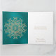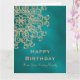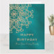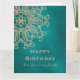 Una hermosa tarjeta de cumpleaños en tonos de TEAL y dorado con un patrón de medallón de sari ornamental de lujo exótico y étnico inspirado en la India con un diseño floral y de ráfaga de loto. Esta elegante y hermosa tarjeta de feliz cumpleaños de estilo indio moderno tiene un tema y aspecto formal de noches árabes o Aladdin de Asia Oriental, Indonesia y/o Marruecos. Diseño © Chrissy H. Studios, LLC. Todos los derechos reservados.