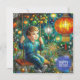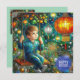 La tarjeta muestra a un chico lindo en un columpio de árbol por la noche. Está encantado con las lámparas de luz y los fuegos artificiales. El saludo en la tarjeta es "Feliz Cumpleaños". La parte trasera de la tarjeta tiene una pequeña versión de la imagen delantera y mucho espacio para escribir un mensaje. AI Bing ayudó en la creación de la tarjeta.