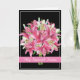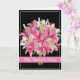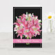 Tarjeta de cumpleaños mostrada con fondo negro y lirios rosa bonito impresos. Personalizar esta tarjeta o compra como está. La tarjeta tiene un mensaje especial dentro.