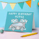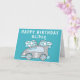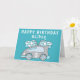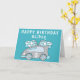 Tarjeta de cumpleaños niño bandera de carreras de coche azul. Esta tarjeta tiene un coche de carreras azul con una edad y banderas de carreras azules y blancas. Agrega tu nombre y la edad en el coche de carreras. Agrega tu mensaje dentro o bórralo.