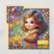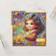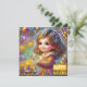 La tarjeta incluye un chica retro en una pantalla de luces con globos brillantes, fuegos artificiales, destellos y velas. El saludo es "Feliz Cumpleaños". La parte trasera tiene una pequeña versión de la imagen delantera y mucho espacio para escribir un mensaje. AI Bing ayudó en la creación de la tarjeta.