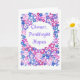 Tarjeta de cumpleaños de bonito, florida para una hermana, con 'Cumpleaños feliz' en galés, rodeada de flores rosas, azules y malvas; de un collage de papel pintado a mano de Judy Adamson.