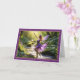 La tarjeta tiene un hermoso hada joven con delicadas alas translúcidas y el cabello rojo que corre, con un vestido morado que fluye con gracia mientras baila en un bosque sereno y soleado. La vegetación exuberante, el musgo suave y la suave corriente de fondo crean un entorno mágico y encantador. El borde de la tarjeta es un rico violeta con elegantes diseños florales dorados que realzan el tema de los cuentos de hadas. Las palabras "Feliz Cumpleaños" están elegantemente escritas en la parte inferior, agregando un toque de encanto y alegría a la escena.