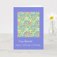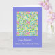 Tarjeta de cumpleaños de bonito de febrero para una madre de paso, con un patrón de primrosis rosa profundo, azul profundo y amarillo, la flor del mes de nacimiento de febrero, de un diseño pintado a mano por Judy Adamson.