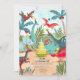 Una tarjeta de cumpleaños de dinosaurio pintada a mano con dinosaurios en una jungla prehistórica. Obra original de Caroline Bonne Müller.