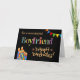 Una tarjeta de cumpleaños brillante y colorida para un novio, con velas de pasteles de cumpleaños, Bunting y Stars y la palabra "profesor" con letras estampadas, delineada en efecto oro (no tinta metálica) y Feliz cumpleaños, también con efecto dorado, todo sobre un fondo negro. Diseño digital de Judy Adamson.