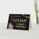 Una tarjeta de cumpleaños brillante y colorida para un socio, con velas de pasteles de cumpleaños, Bunting y Stars y la palabra "Partner" en letras estampadas, delineada en efecto oro (no tinta metálica) y Cumpleaños feliz, también con efecto oro, todo sobre un fondo negro. Diseño digital de Judy Adamson.