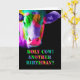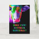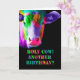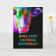 Todos los colores del arcoiris - una vaca multicolor, en un fondo negro con el texto "¡Santa vaca! ¿Otro cumpleaños?" esta tarjeta está en blanco dentro para tu propio mensaje personal.