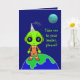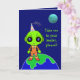 La tarjeta de cumpleaños es la estrella de un alien que tiene una segunda opinión sobre "Llévame a tu líder". Sátira ligera de los acontecimientos actuales.