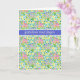 Una tarjeta de cumpleaños de bonito con 'Cumpleaños feliz' en noruego y un patrón de primrosis rosa profundo, azul profundo y amarillo, de un diseño pintado a mano por Judy Adamson.