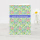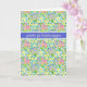 Tarjeta de cumpleaños bonito con 'Cumpleaños feliz' en sueco y un patrón de primrosis rosa profundo, azul profundo y amarillo, de un diseño pintado a mano por Judy Adamson.