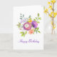 Envíale una hermosa tarjeta de cumpleaños que ella valorará. Flores de verano moradas, blancas y amarillas, enclavadas en hojas verdes suaves. Feliz cumpleaños está escrito debajo de las flores y en el interior. Ambos se pueden personalizar por separado para que sus deseos de cumpleaños sean únicos.