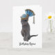 Un gato gris real lleva un turbante con perlas. Enviar esta tarjeta de "Reina de cumpleaños" a alguien especial