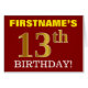 Este diseño de tarjetas de felicitación de cumpleaños incluye un mensaje como "¡13 cumpleaños de FIRSTNAME!", y el "13" tiene un aspecto de color falso/imitación de oro. El nombre del destinatario en la parte delantera puede ser personalizado, y el fondo delantero está pintado de rojo. También incluye un mensaje de bienvenida de cumpleaños de personalizable en el interior. Una tarjeta de felicitación de cumpleaños como esta podría ser dada a alguien en celebración de su décimo tercer cumpleaños. [~Z0000184]