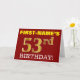 Este diseño de tarjetas de felicitación de cumpleaños incluye un mensaje como "¡53 cumpleaños de NOMBRE PRIMERO!", mientras que el "53" tiene un aspecto de color falso/imitación de oro. El nombre del destinatario en la parte delantera puede ser personalizado, y el fondo delantero está pintado de rojo. También incluye un mensaje de bienvenida de cumpleaños de personalizable en el interior. Una tarjeta de felicitación de cumpleaños como esta podría ser dada a alguien en celebración de su cincuenta tercer cumpleaños. [~Z0000184]