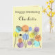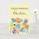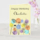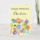 Tarjeta de cumpleaños de estilo retro, flor de líneas en un fondo pastel con círculos de colores pastel retro.