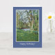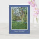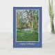 Una tarjeta de felicitación del cumpleaños, con un riverbank en un día quebradizo, brillante en primavera temprana, con los narcisos debajo de los árboles y los snowdrops en la hierba, de una pintura en colores pastel suave de Judy Adamson. Por favor no dude en modificar el mensaje para requisitos particulares interior.
