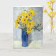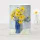 Una tarjeta de cumpleaños con un original cuadro de flores de color pastel de aceite en un gran jarrón azul.