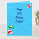 Tarjeta de cumpleaños para Delilah con un divertido tema de piscina, decorada con una bola de playa roja, paraguas verdes, sandalias y aceite de sol sobre un fondo azul acuoso con olas onduladas.