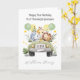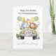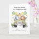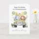 Esta tarjeta de cumpleaños de acuarela para el primer cumpleaños es adecuada para un niño o una niña. El diseño incluye estrellas de cumpleaños, globos de cumpleaños verdes y amarillos, y un coche safari con un elefante, una jirafa y un león dentro. Todo el texto es totalmente personalizable.