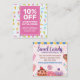 ¿Está tu negocio de dulces con delicias azucaradas y dulces listos para la venta? Comparte tus maravillas de golosinas con una tarjeta de cupón de descuento que atraerá a los clientes para realizar pedidos en tu tienda. ¿A quién no le gustan los dulces, los chocolates, los bizcochos y los dulces? Este diseño lúdico desata alegría con un patrón de dulces de paletas, helados, copas y dulces de colores alegres que harán que los clientes se deleiten con su diente dulce en su tienda. Puedes añadir esta tarjeta de oferta especial a las bolsas para eventos y otras formas de anunciar tu venta y conseguir más clientes en tu tienda física o online de dulces o chocolate. Orientado a las tiendas de dulces y panaderías que venden productos horneados, pastelitos, dulces, chocolates, heladerías y otras empresas de dulces y postres. La tarjeta le permite introducir su porcentaje de venta, términos y condiciones y añadir su información comercial.