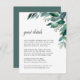 Diseñadas para coincidir con nuestra colección de invitaciones a bodas de Abundant Foliage, estas elegantes tarjetas botánicas de información cuentan con un spray de hojas de eucalipto acuarela y follaje verde. ¿Se pregunta qué información incluir en un anuncio de invitación a la boda? Considere detalles como alojamiento en hotel, códigos de grupo, transporte, direcciones, información de recepción de bienvenida y url de su sitio web boda. Incluso puede cargar un mapa en el reverso usando la función Personalizar.