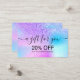 ¡¿A quién no le gusta un buen descuento?! Trate a sus clientes con nuestro diseño holográfico moderno. Si desea cambiar el estilo de letra, color o ubicación del texto, simplemente haga clic en el botón "Personalizar más adelante". Si necesitas ayuda con el diseño, por favor no dudes en contactarme!