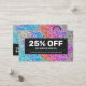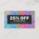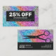 Mejore la marca de su salón e impulse el compromiso del cliente con esta atractiva tarjeta de visita y juego de cupones. El vibrante diseño purpurina arcoiris es memorable y elegante, y el 25% de descuento le da a los clientes un fantástico incentivo para reservar su próxima cita. Personalizar con sus detalles y hacer una impresión duradera!