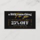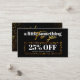 Eleva la imagen de tu peluquería con estas tarjetas de descuento de moda. La sofisticada paleta de colores negro y dorado comunica de inmediato lujo y calidad. Este diseño presenta una combinación única de patrones geométricos modernos y una tipografía elegante, creando una carta visualmente atractiva y memorable. La oferta de 25% de descuento se expone de forma destacada, lo que garantiza que los clientes no perderán este incentivo especial. Dé a sus clientes una razón para celebrar y elegir su salón con este irresistible trato!