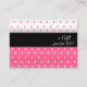 Vale - diseño exclusivo hermoso que ofrece un diseño del negro, blanco y rosado del lunar. Hace un gran vale para los salones de belleza, los balnearios, los cosmetologists, los salones del clavo, los estudios de la danza, los boutiques, los diseñadores, los estilistas del pelo y de la moda, los profesionales al por menor, personalizable del etc… 100%. Aliste para completar las cajas o para hacer clic en el botón del PERSONALIZAR para añadir, para mover, para suprimir, para volver a clasificar según el tamaño o para cambiar la fuente o gráficos uces de los. Hecho con vector de alta resolución y/o los gráficos digitales para una impresión profesional. NOTA: (ESTO ES UNA IMPRESIÓN. Todos los diseños de producto del zazzle son las "impresiones" a menos que estén indicados de otra manera bajo "sobre área de este producto") que el diseño será impreso exactamente como usted considera que en la pantalla y en el producto… satisface tan se asegura de cuando usted hace sus cambios en volver a clasificar según el tamaño de gráficos o del texto uces de los que cabe en las áreas correctamente y que es su deletreo y fraseología cómo usted tiene gusto de ella para estar de tamaño, color y fuente. Si usted hace que algunas preguntas sobre este diseño por favor me entren en contacto con en siggyscott@comcast.net o visiten mi vínculo de la tienda: http://www.zazzle.com/designsbydonnasiggy?rf=238713599140281212 (copia y goma) me placeré ayudar. Gracias por la ayuda y la detención por mi tienda - DesignsbyDonnaSiggy. © Donna Siegrist