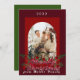 Tarjeta de deseo de Navidad, color rojo cereza y fondo de color verde natural con código QR para redes sociales o sitio web. Agregue su propia foto de familia o tienda. También se puede agregar al regalo.